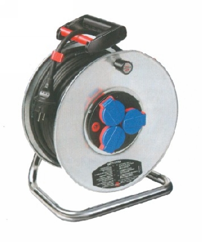 电缆绕线器,用于接长电源送电半径。230V,3个安全插座,带防尘保护盖。钢卷盘耐摔撞磕碰,表面镀锌防止生锈,锁紧制动功能,电缆固定别扣。过热过载双重保护,防止电压瞬时升高。钢架结实耐用,方便携带。