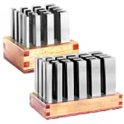 In wooden stand. Plain parallel, fine-ground, in pairs. Size data on front of product. Sets offer a large range with 1 mm graduation. Case-hardened. Pair tolerance tp at height IT 5. Rated dimensional tolerance in height and width ±0.01 mm. Remaining dime