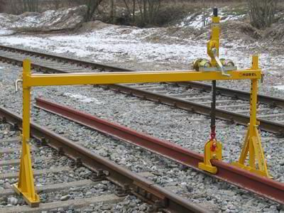 用于工作场所钢轨的铺设和移动 易拆装,用于运输和运走 有两个支架,一个横梁,一个移动起重机和一个滚轴搬运钳 横木的高度调整 折叠式手柄,木质脚,导辊 有保护装置和负载压力刹车的起重机 有或没有刹车