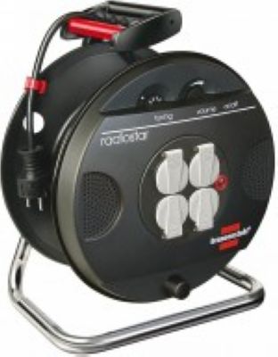 With loud-speaker. 4 earthed sockets with self-closing covers. Reel body made from special Breflex plastic on a galvanised frame. Thermal cut-out protection, indicator shows overheating or overloading. In colourful display-packaging.